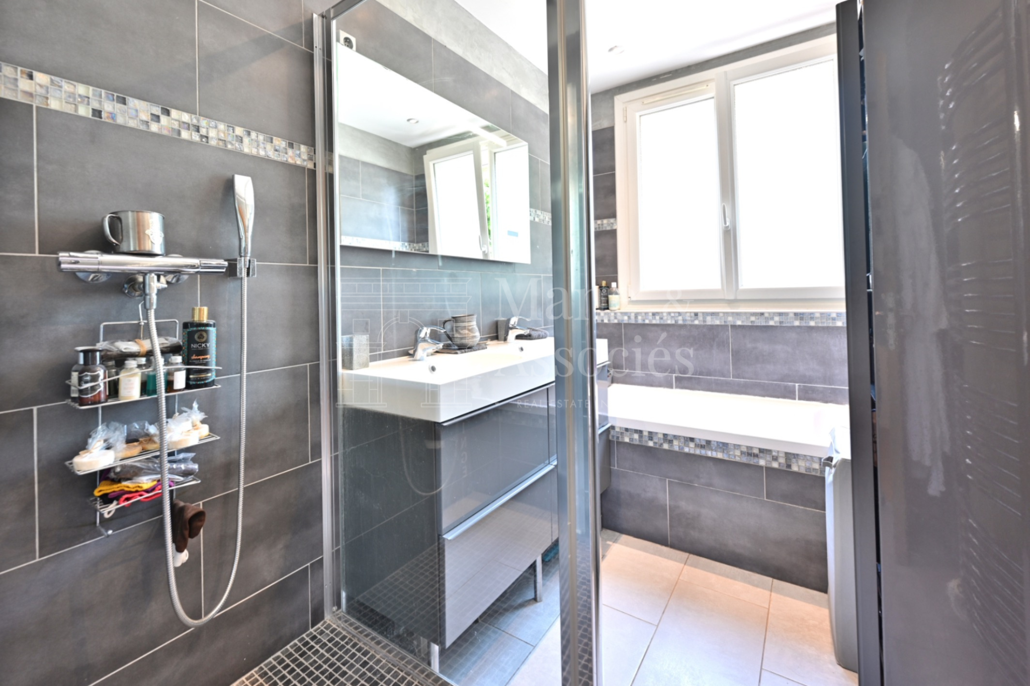 Il se compose d’une entrée menant à un double séjour avec salle à manger, d’une cuisine indépendante équipée et spacieuse, ainsi que d’une salle de bain avec baignoire, douche et double vasque. Deux chambres confortablescomplètent cet espace, avec la possibilité d’en créer une troisième.
